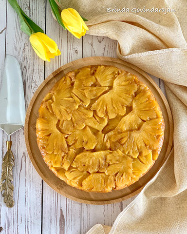 Pineapple upside down cake is one of my favourite cakes!! I was fascinated when I came across a Mauritian spiced cake version by Ottolenghi - ‘Pineapple ring of fire cake’. This delectable cake is made from a combination of spices in the cake batter: Aleppo chilli flakes, star anise powder, cinnamon powder, vanilla essence, desiccated coconut topped with pineapple slices, that is simmered in a caramel sauce made of sugar, ginger and tamarind juice. Icing on the cake is a dressing of rum on top and literally setting it on fire. It’s captivating to see the rum catch fire as it blazes in circles!! I would love to bake this cake just to watch the cake on fire!! The medley of these wonderful ingredients elevates the cake to another level, fell in love with it instantly. My new favourite version of pineapple upside down cake!!